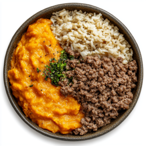 Un plato simple y nutritivo que combina pavo magro, batata y arroz integral. La batata es una fuente excelente de fibra y vitaminas, mientras que el pavo aporta proteínas magras, haciendo de esta receta una opción saludable y deliciosa para cualquier perro.