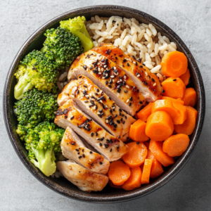 - En un tazón grande, mezcla el pollo, el brócoli, las zanahorias y el arroz integral.