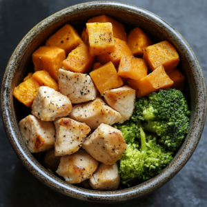 - En un tazón grande, mezcla los trozos de pollo con las batatas asadas.